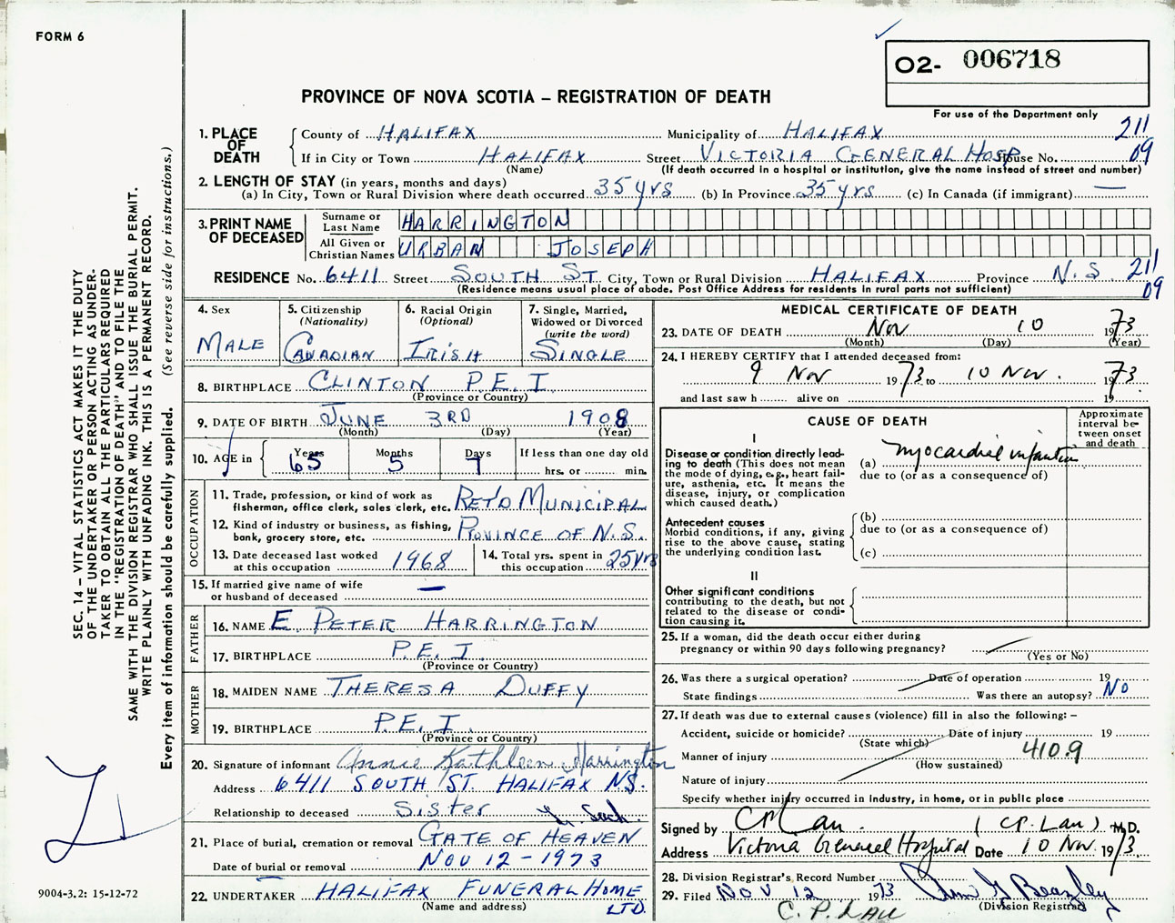 Male Death Registration: Year: 1973 number: 6718