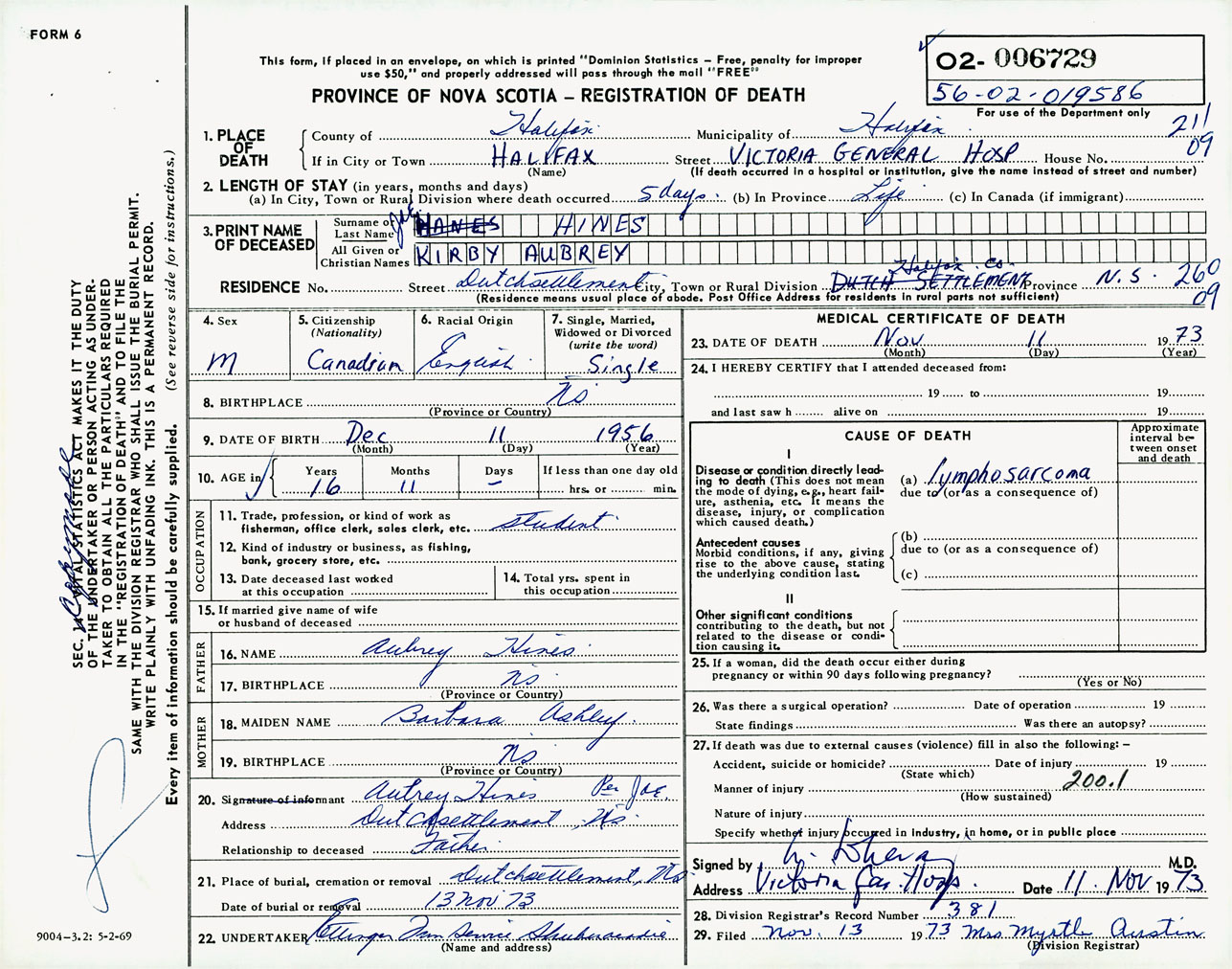 Male Death Registration: Year: 1973 number: 6729