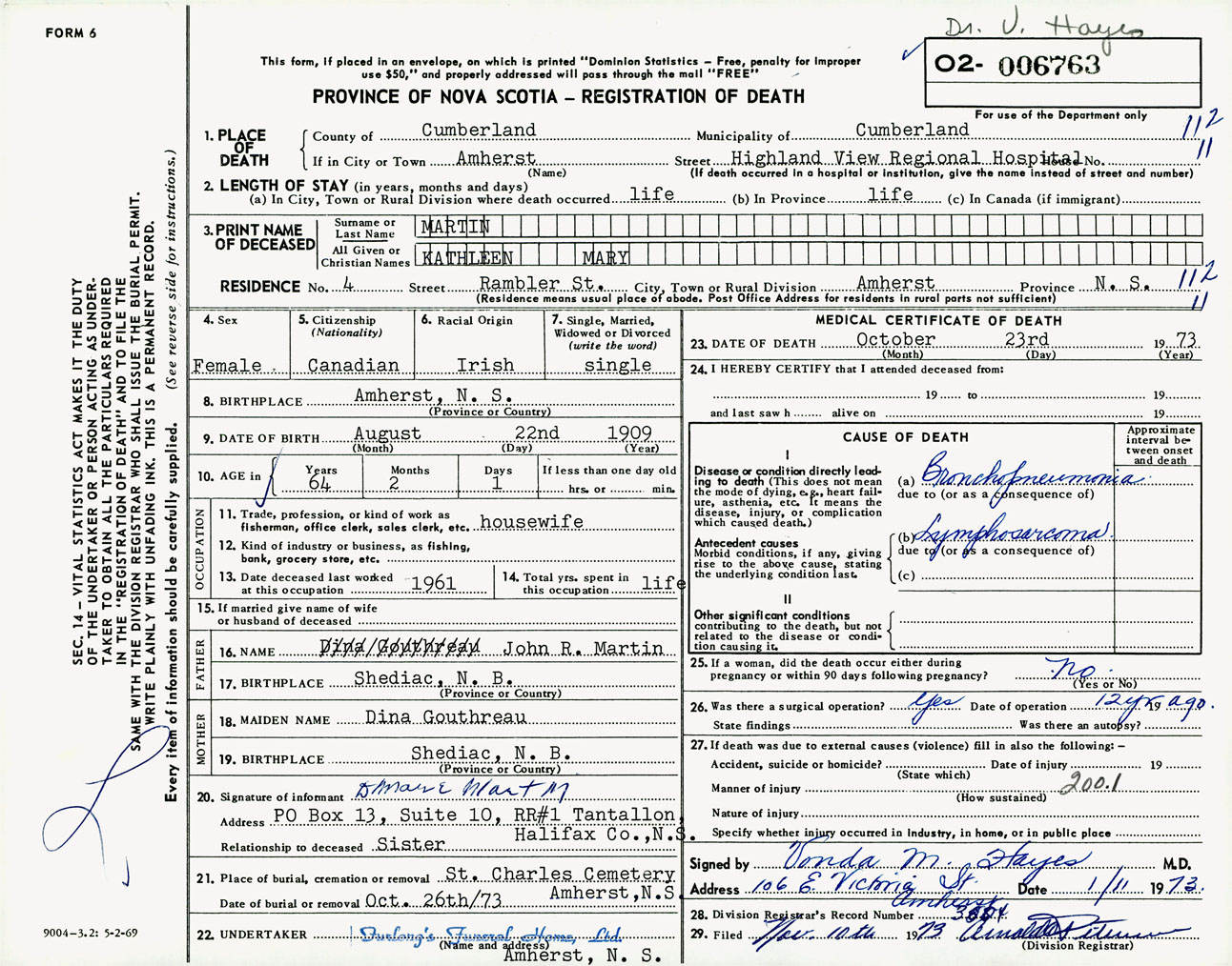 Female Death Registration: Year: 1973 number: 6763
