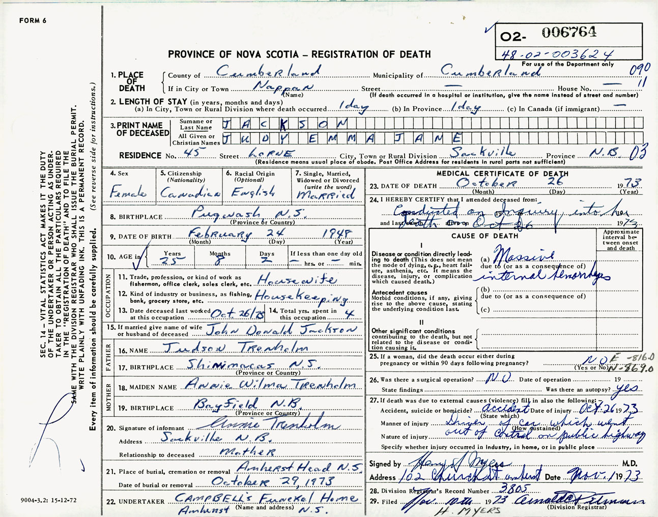 Female Death Registration: Year: 1973 number: 6764