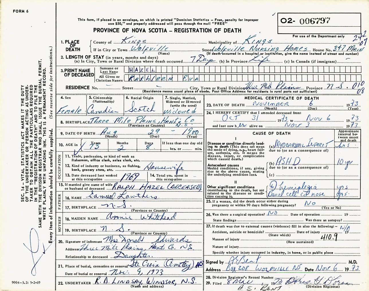 Female Death Registration: Year: 1973 number: 6797
