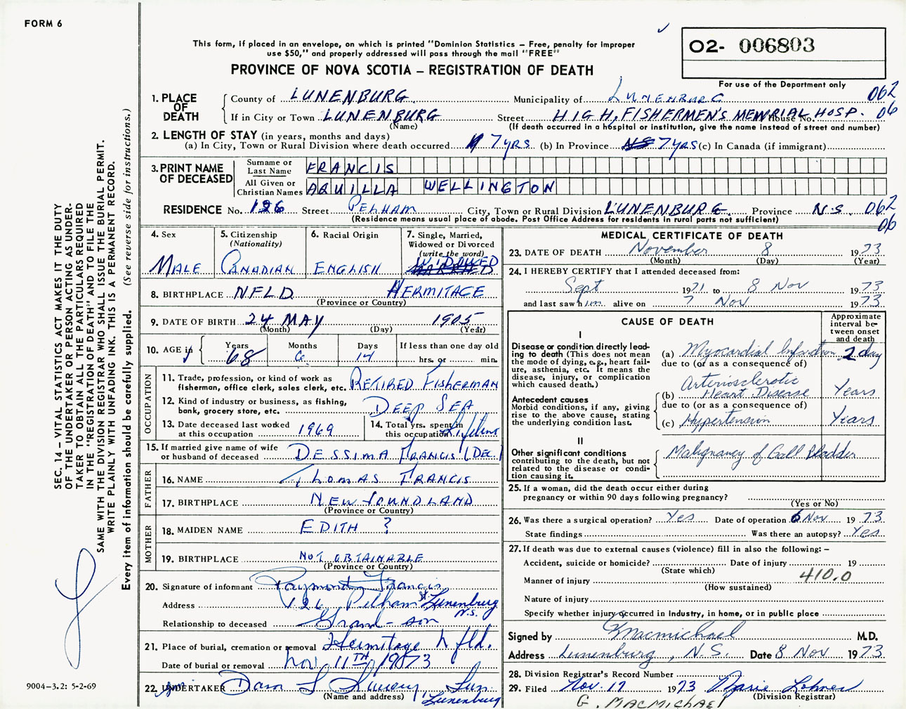 Male Death Registration: Year: 1973 number: 6803