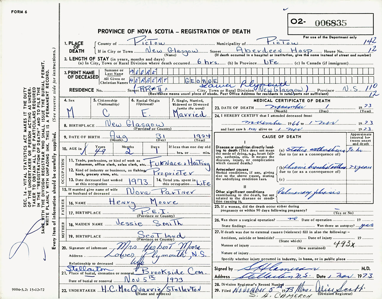 Male Death Registration: Year: 1973 number: 6835