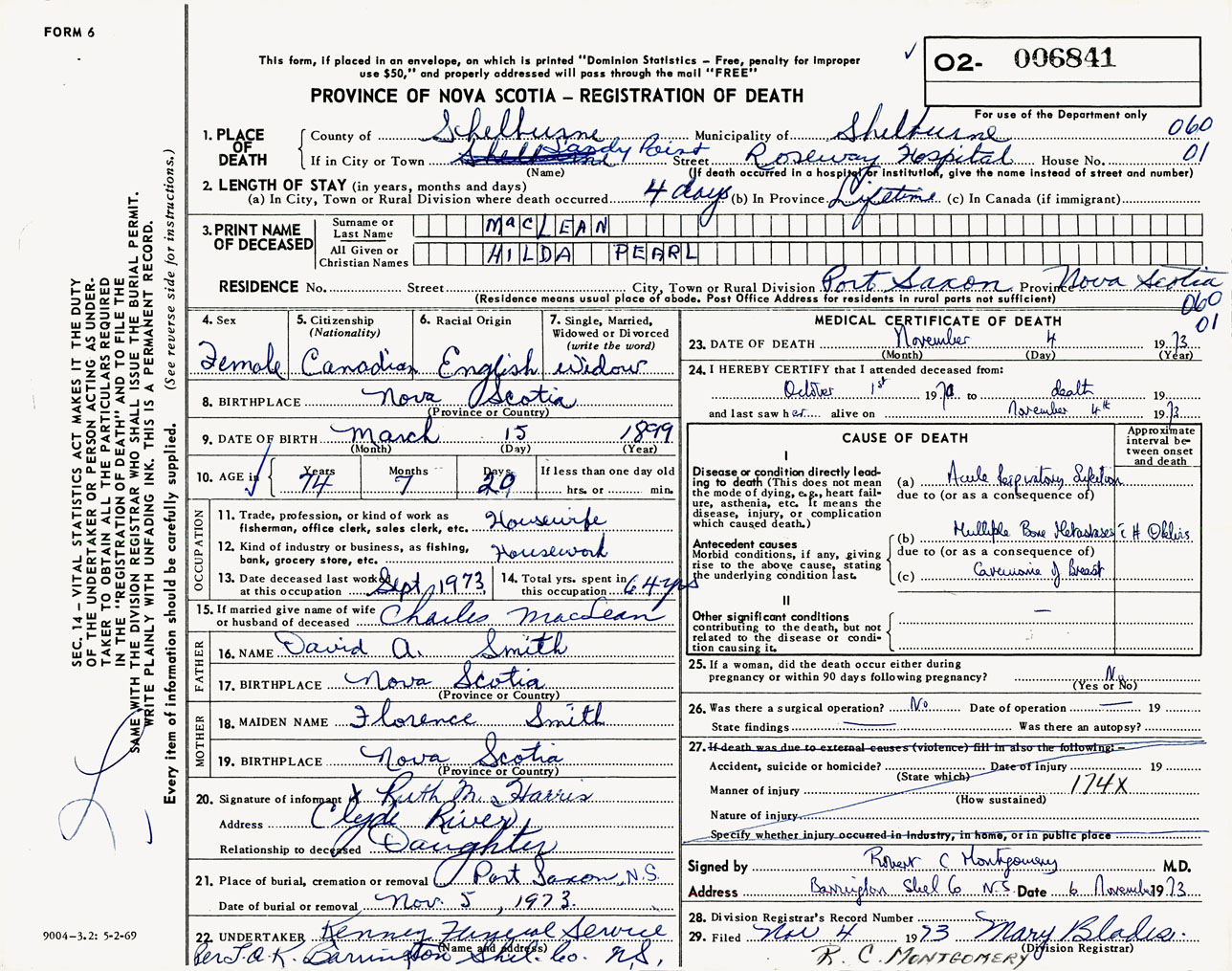 Female Death Registration: Year: 1973 number: 6841