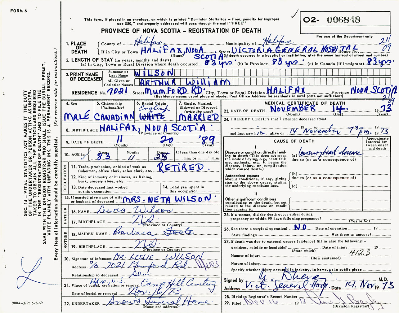 Male Death Registration: Year: 1973 number: 6848