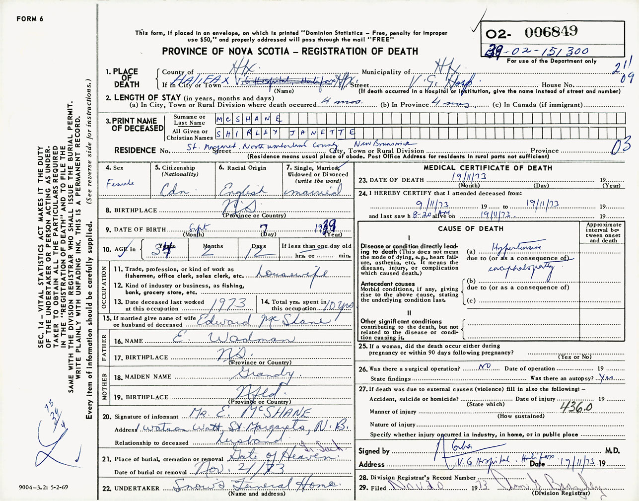 Female Death Registration: Year: 1973 number: 6849