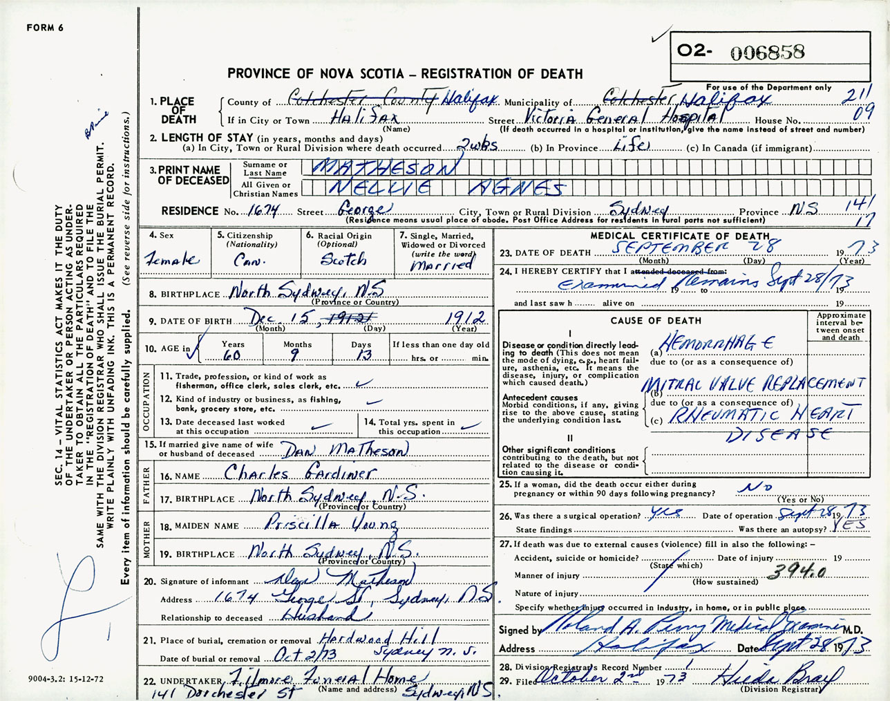 Female Death Registration: Year: 1973 number: 6858