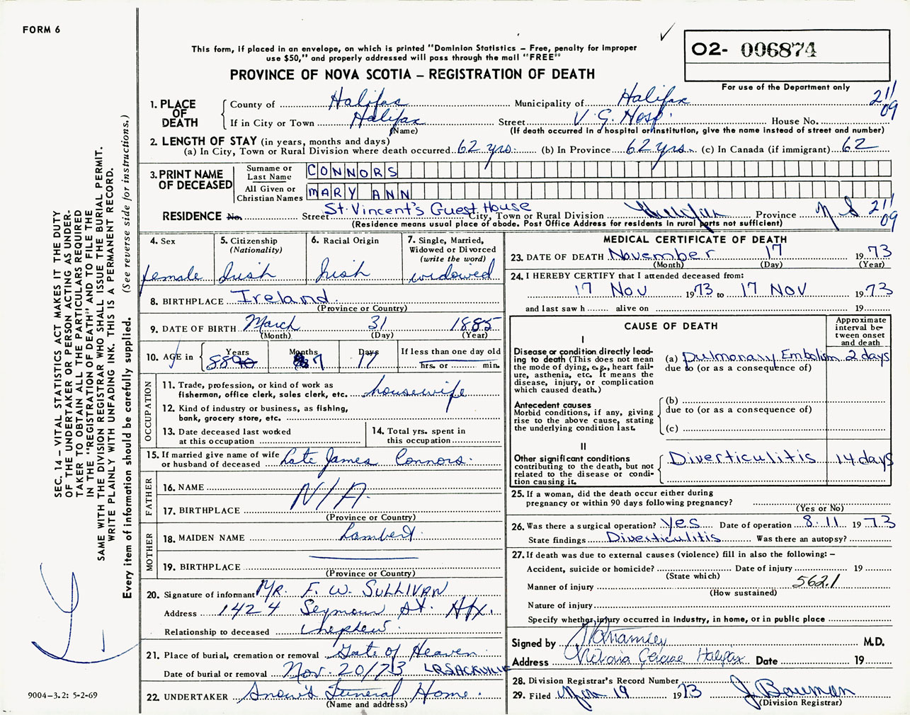 Female Death Registration: Year: 1973 number: 6874