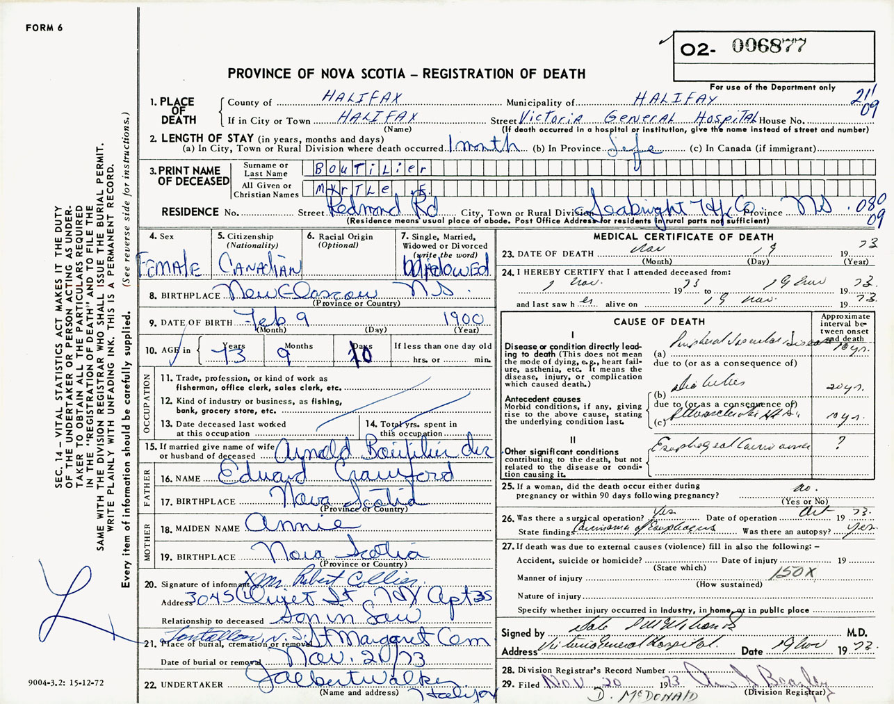 Female Death Registration: Year: 1973 number: 6877