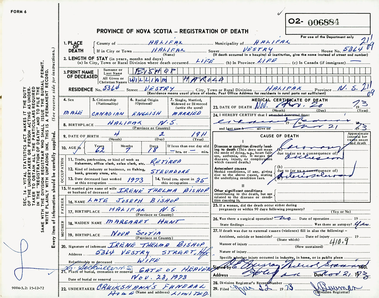 Male Death Registration: Year: 1973 number: 6884