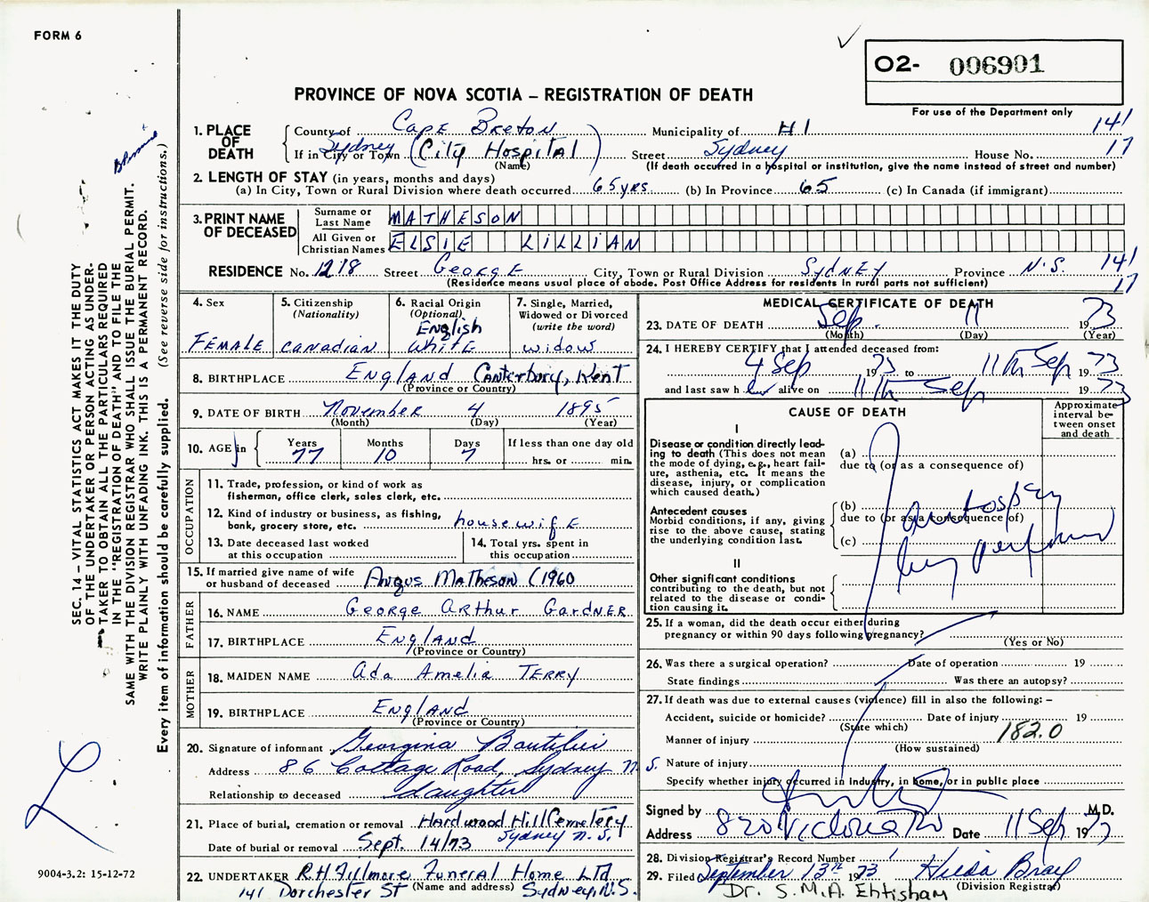 Female Death Registration: Year: 1973 number: 6901