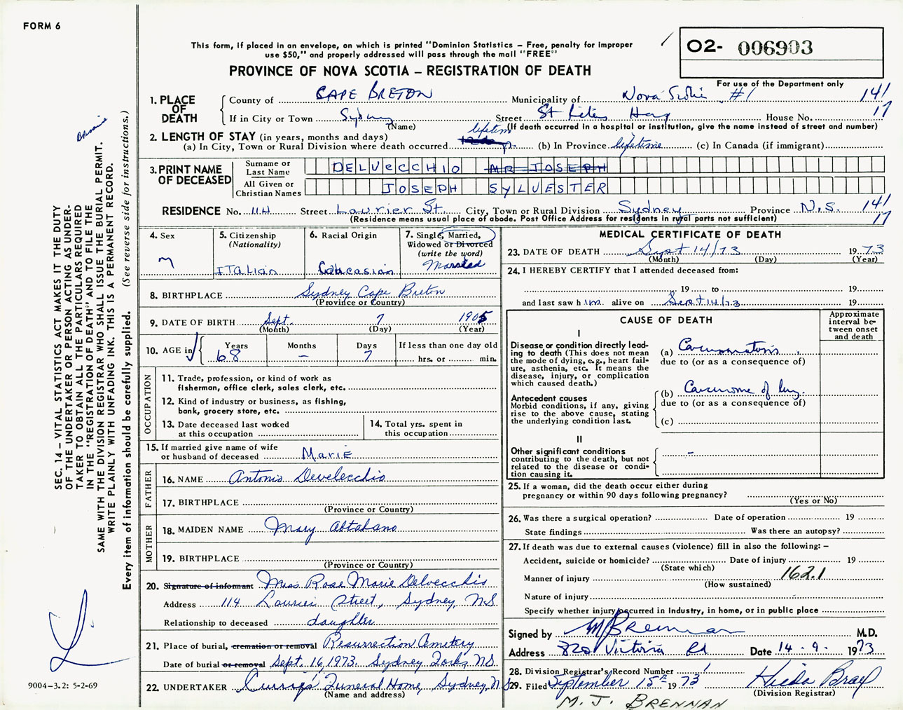 Male Death Registration: Year: 1973 number: 6903