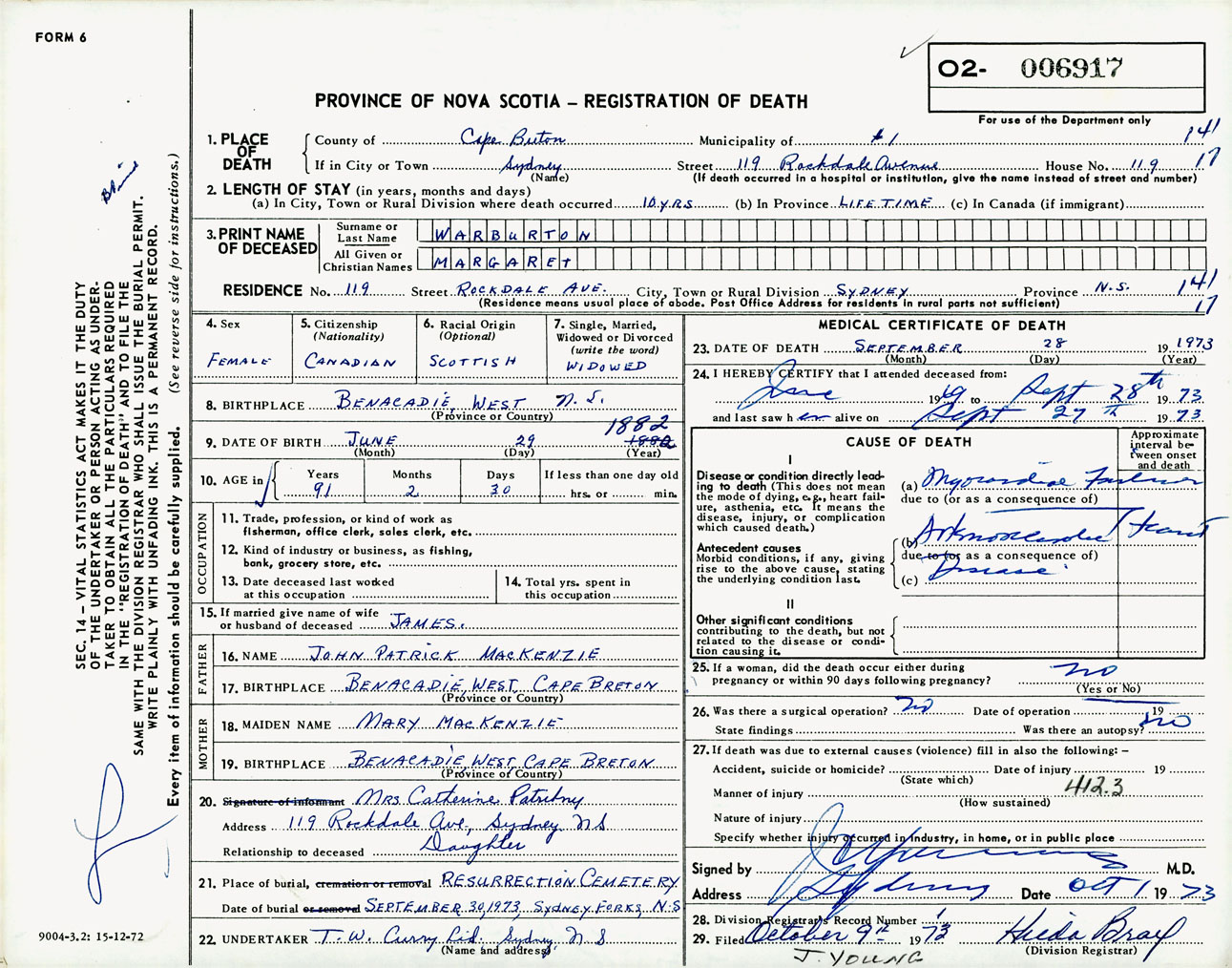 Female Death Registration: Year: 1973 number: 6917