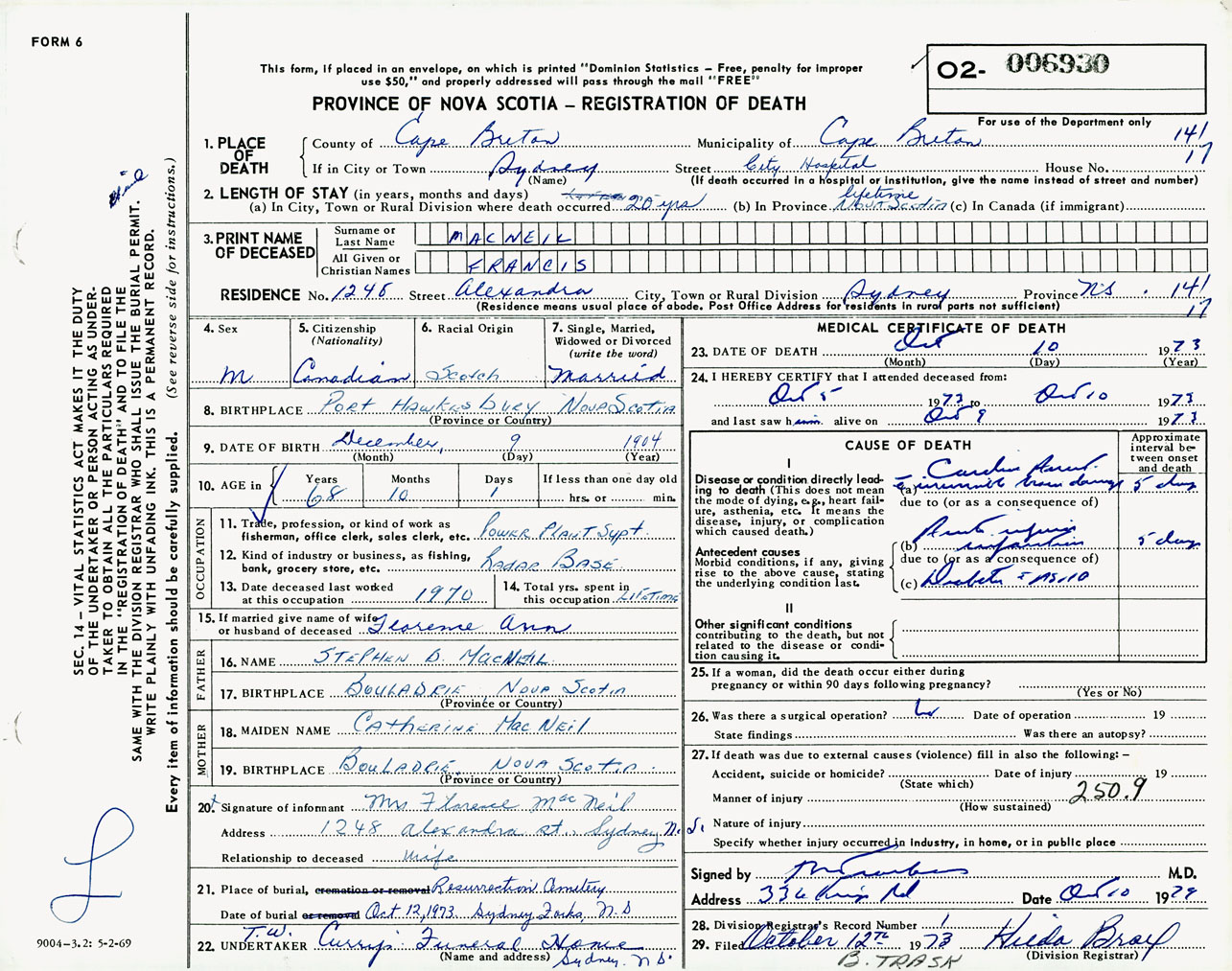 Male Death Registration: Year: 1973 number: 6930