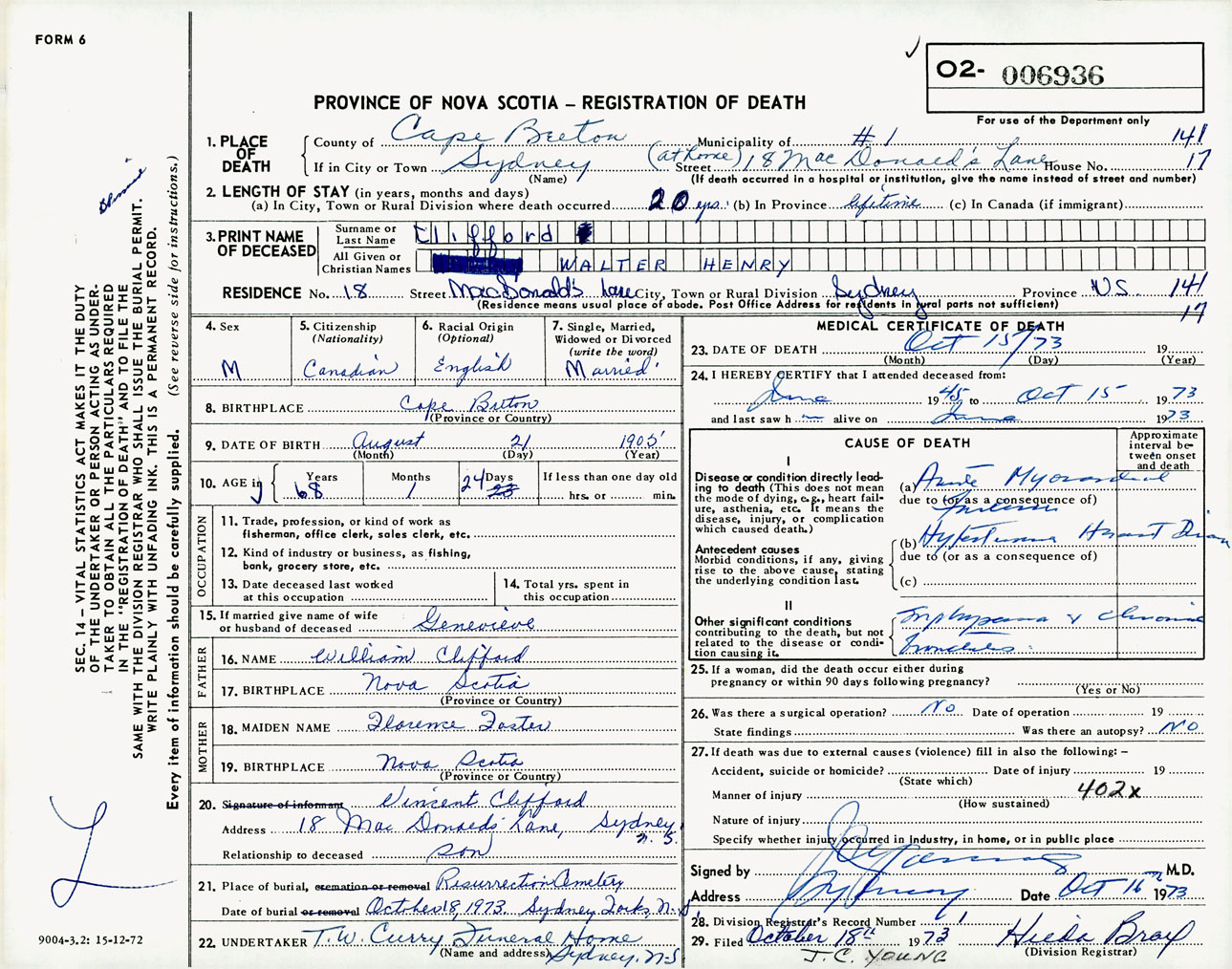 Male Death Registration: Year: 1973 number: 6936