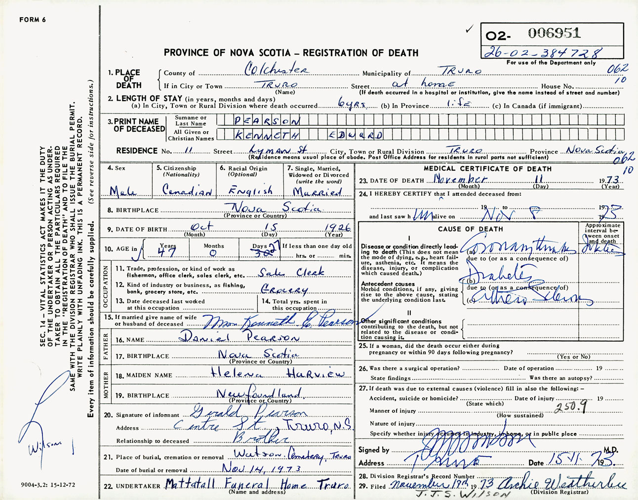 Male Death Registration: Year: 1973 number: 6951