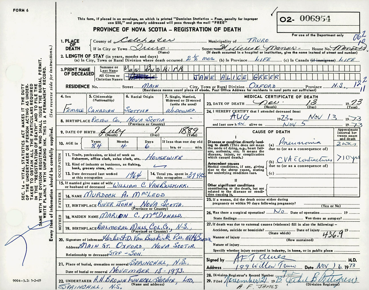 Female Death Registration: Year: 1973 number: 6954