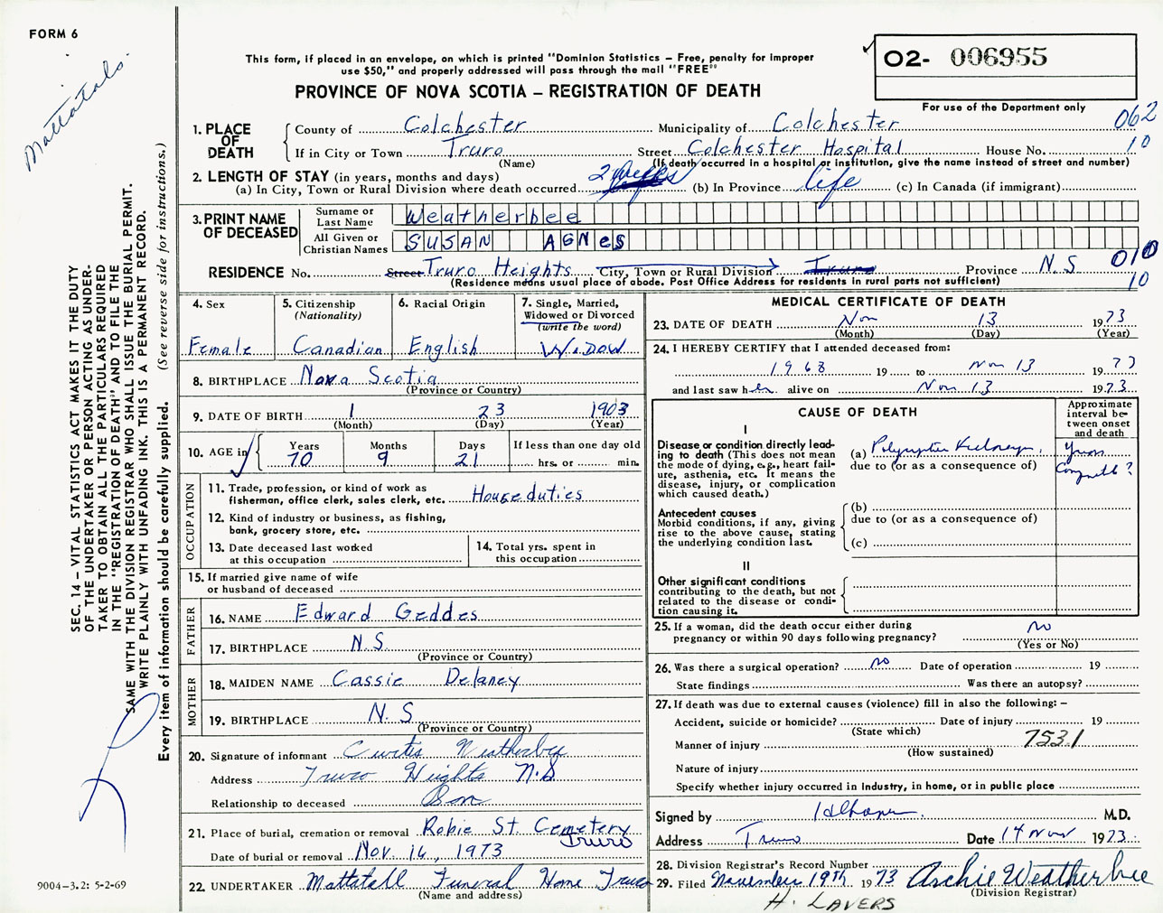 Female Death Registration: Year: 1973 number: 6955