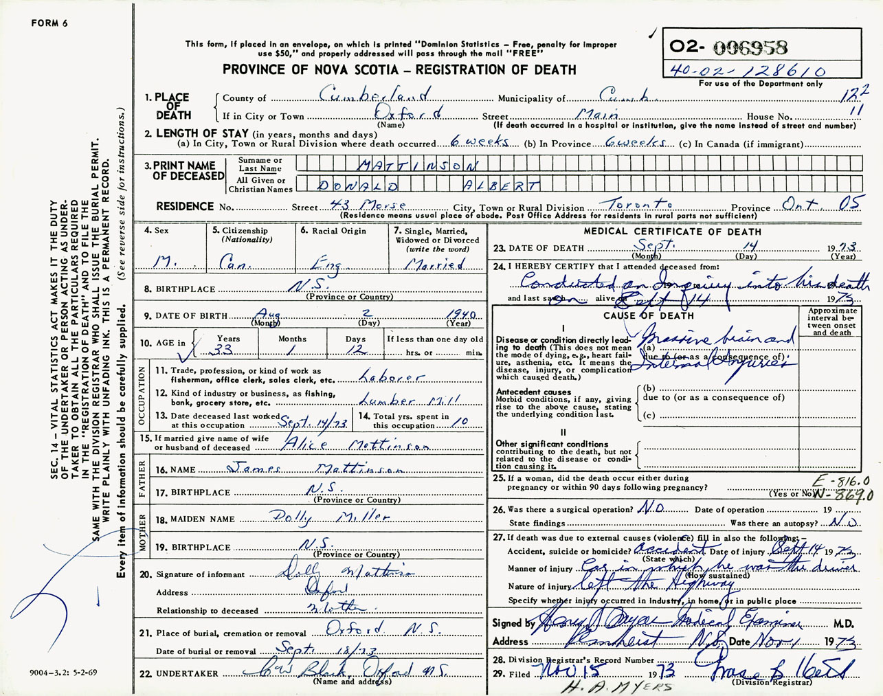 Male Death Registration: Year: 1973 number: 6958