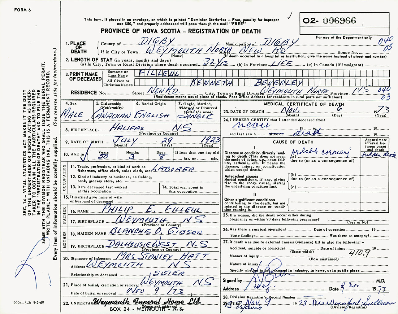 Male Death Registration: Year: 1973 number: 6966