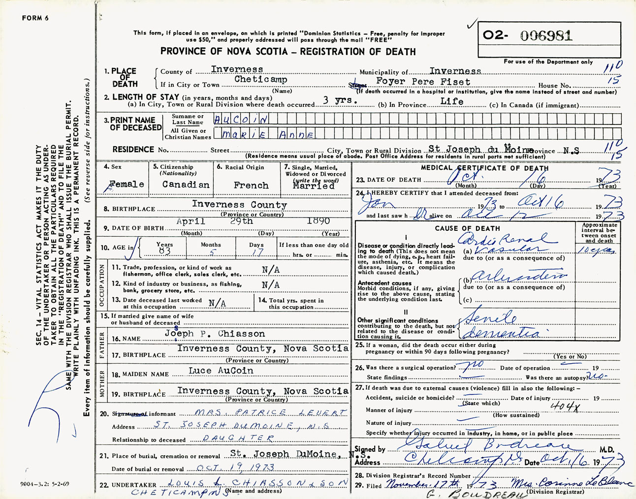 Female Death Registration: Year: 1973 number: 6981