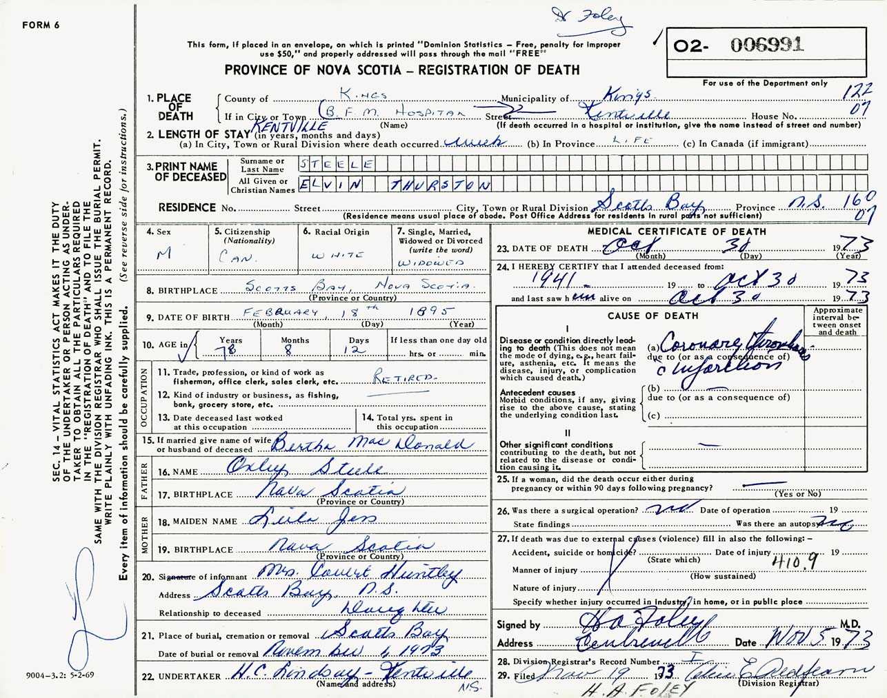 Male Death Registration: Year: 1973 number: 6991