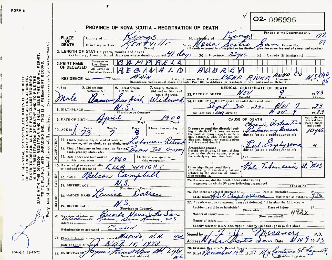 Male Death Registration: Year: 1973 number: 6996