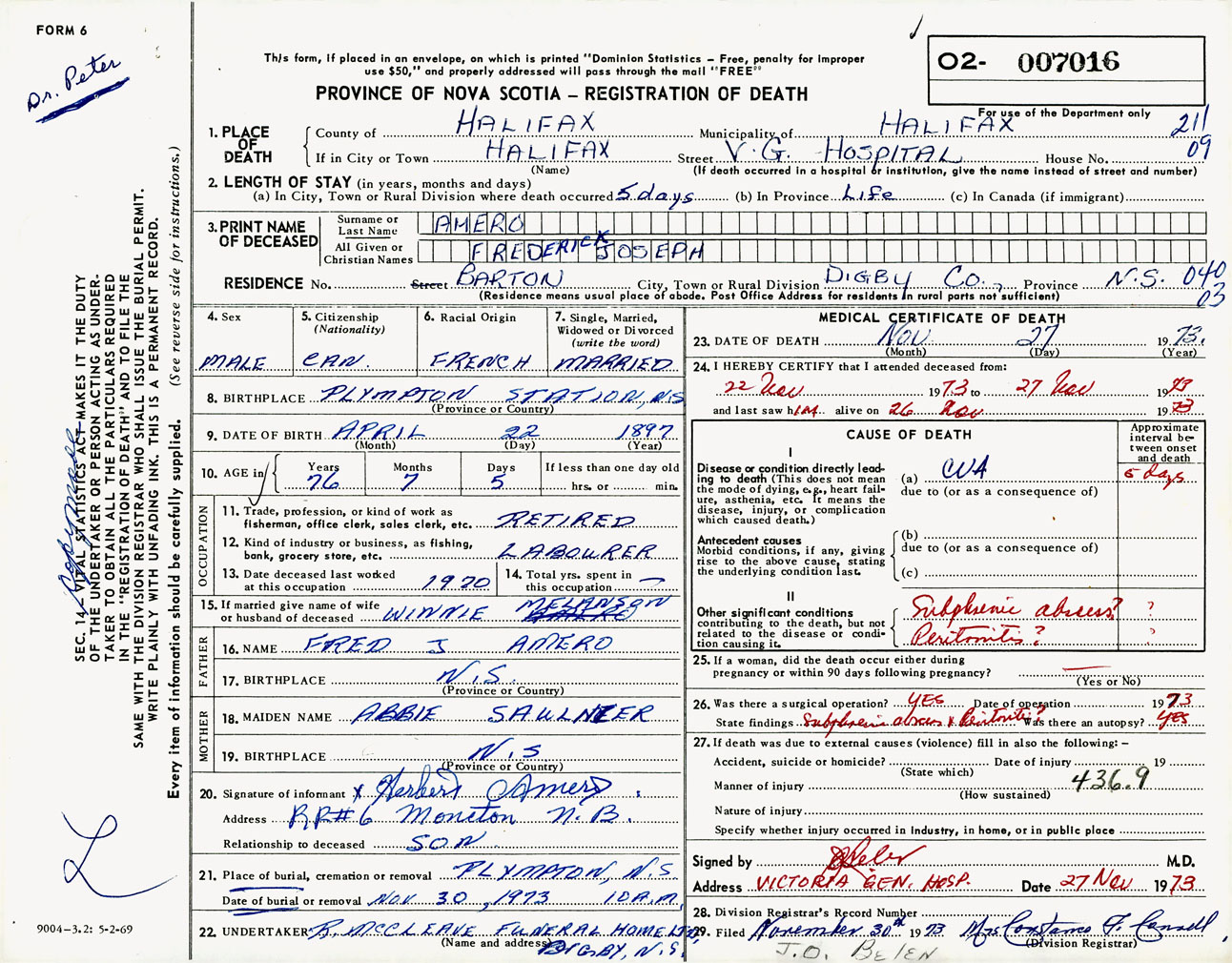 Male Death Registration: Year: 1973 number: 7016