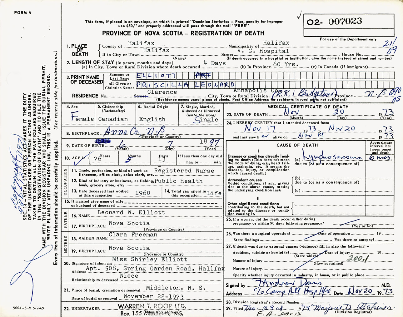 Female Death Registration: Year: 1973 number: 7023