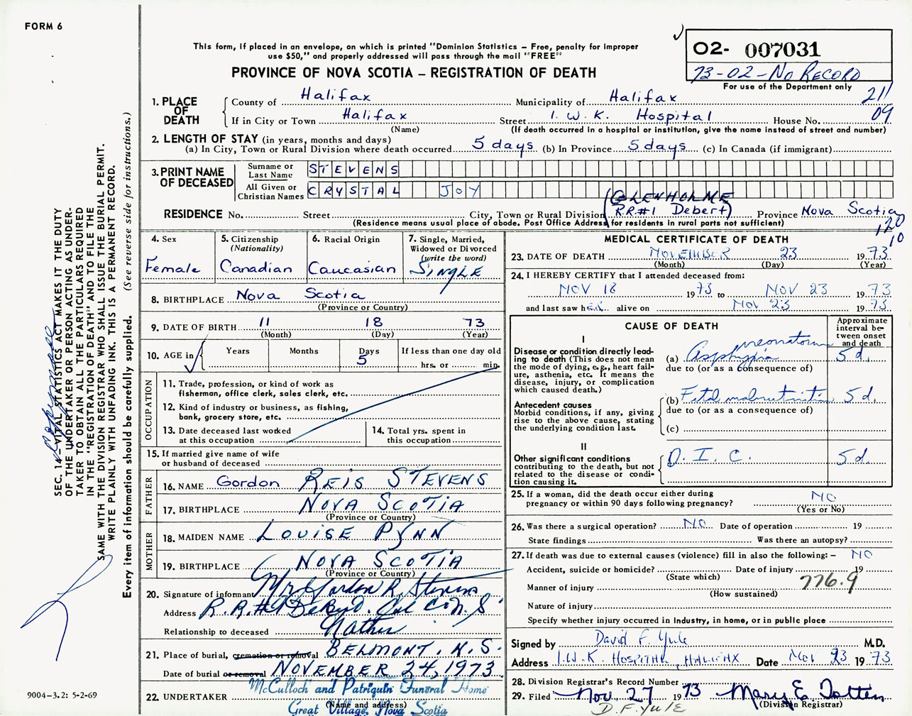 Female Death Registration: Year: 1973 number: 7031