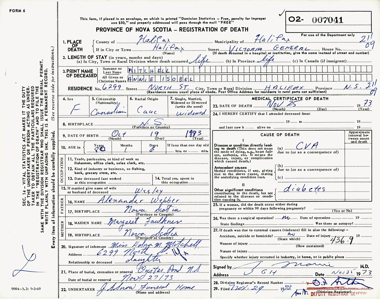 Female Death Registration: Year: 1973 number: 7041
