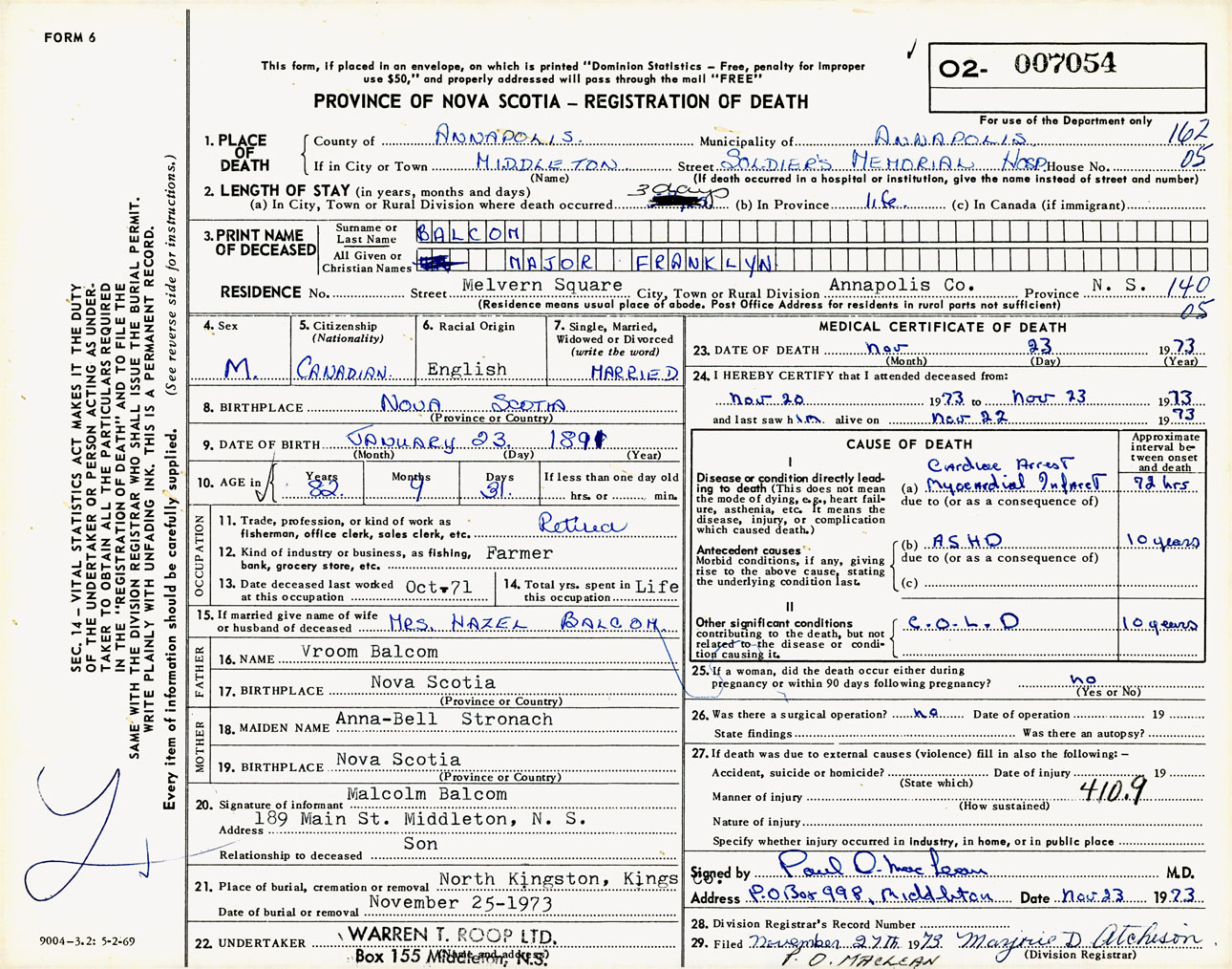 Male Death Registration: Year: 1973 number: 7054