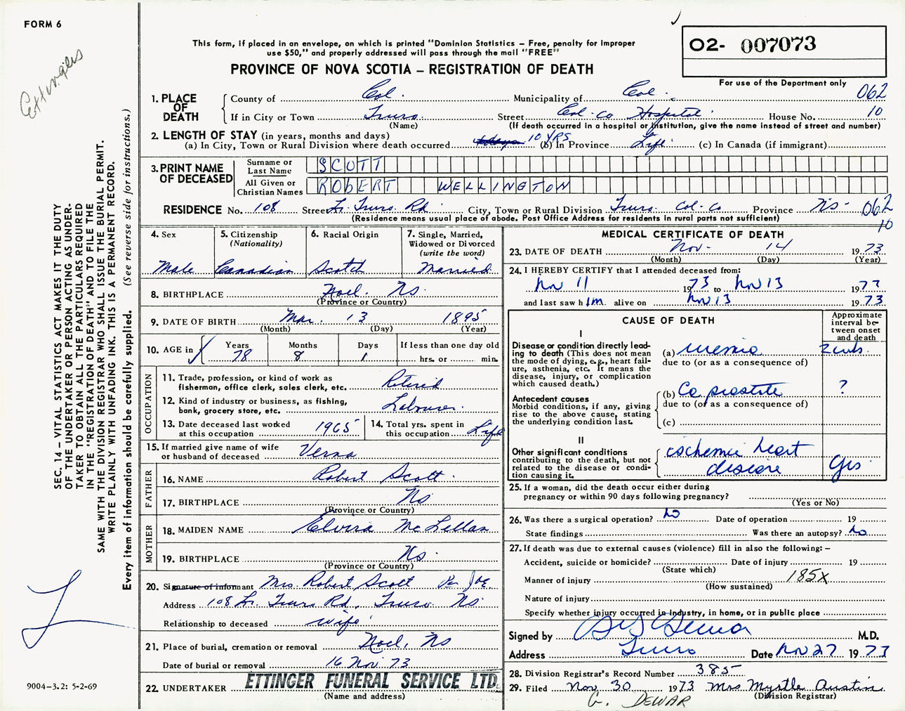 Male Death Registration: Year: 1973 number: 7073
