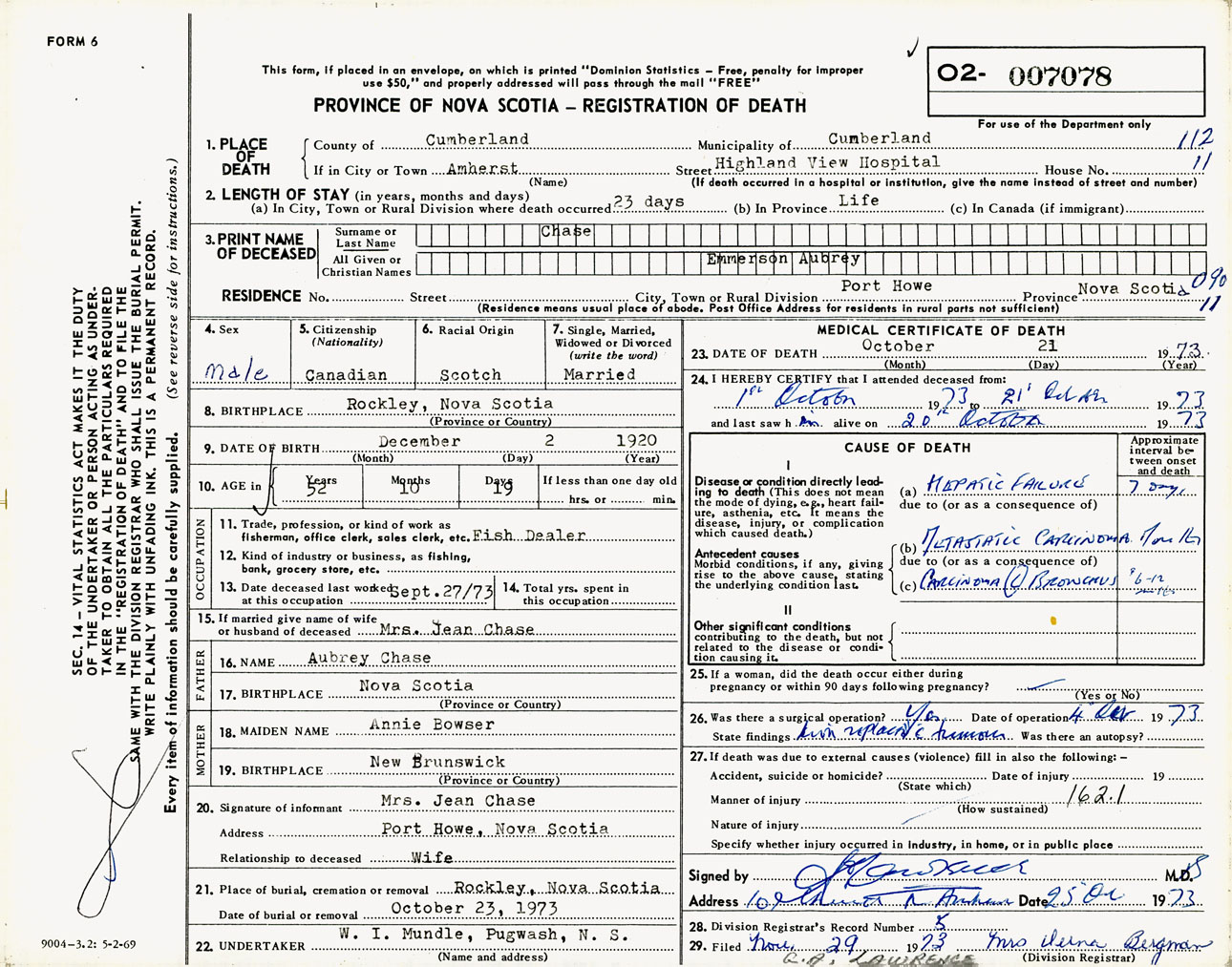 Male Death Registration: Year: 1973 number: 7078