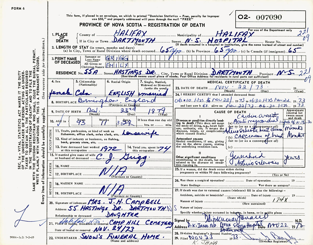 Female Death Registration: Year: 1973 number: 7090
