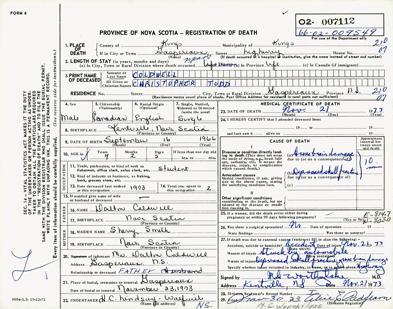 Male Death Registration: Year: 1973 number: 7112