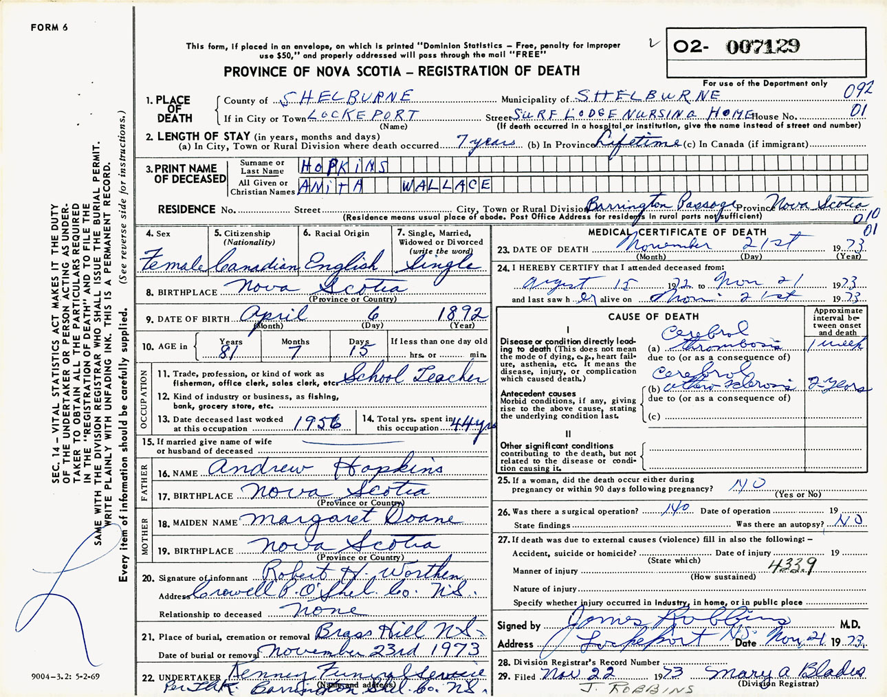 Female Death Registration: Year: 1973 number: 7129