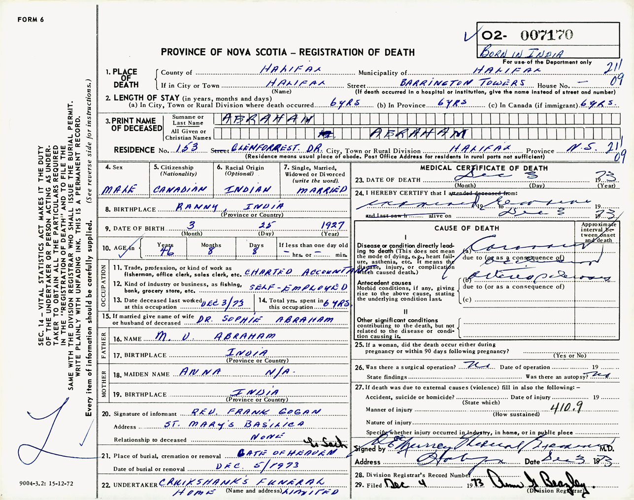 Male Death Registration: Year: 1973 number: 7170