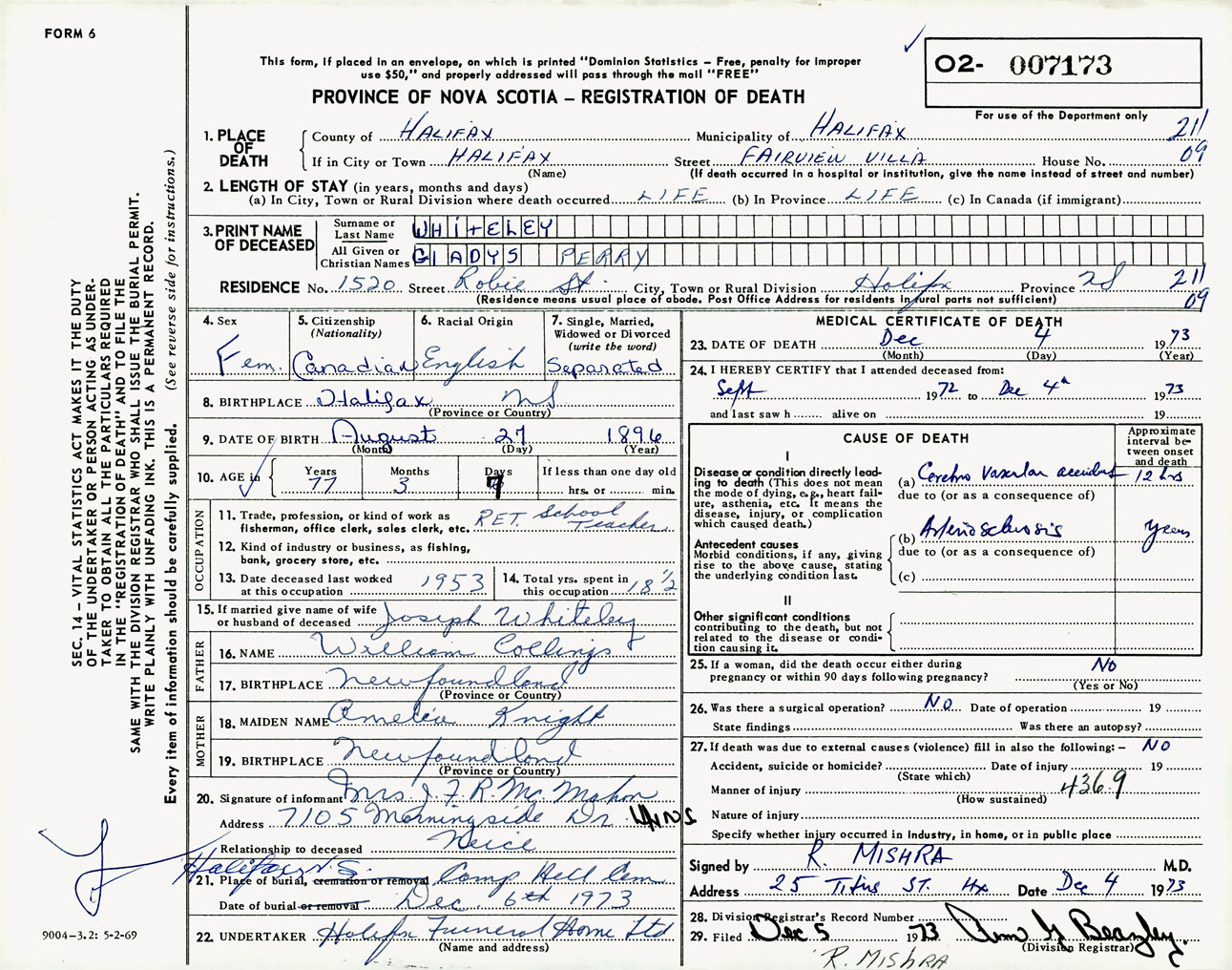 Female Death Registration: Year: 1973 number: 7173