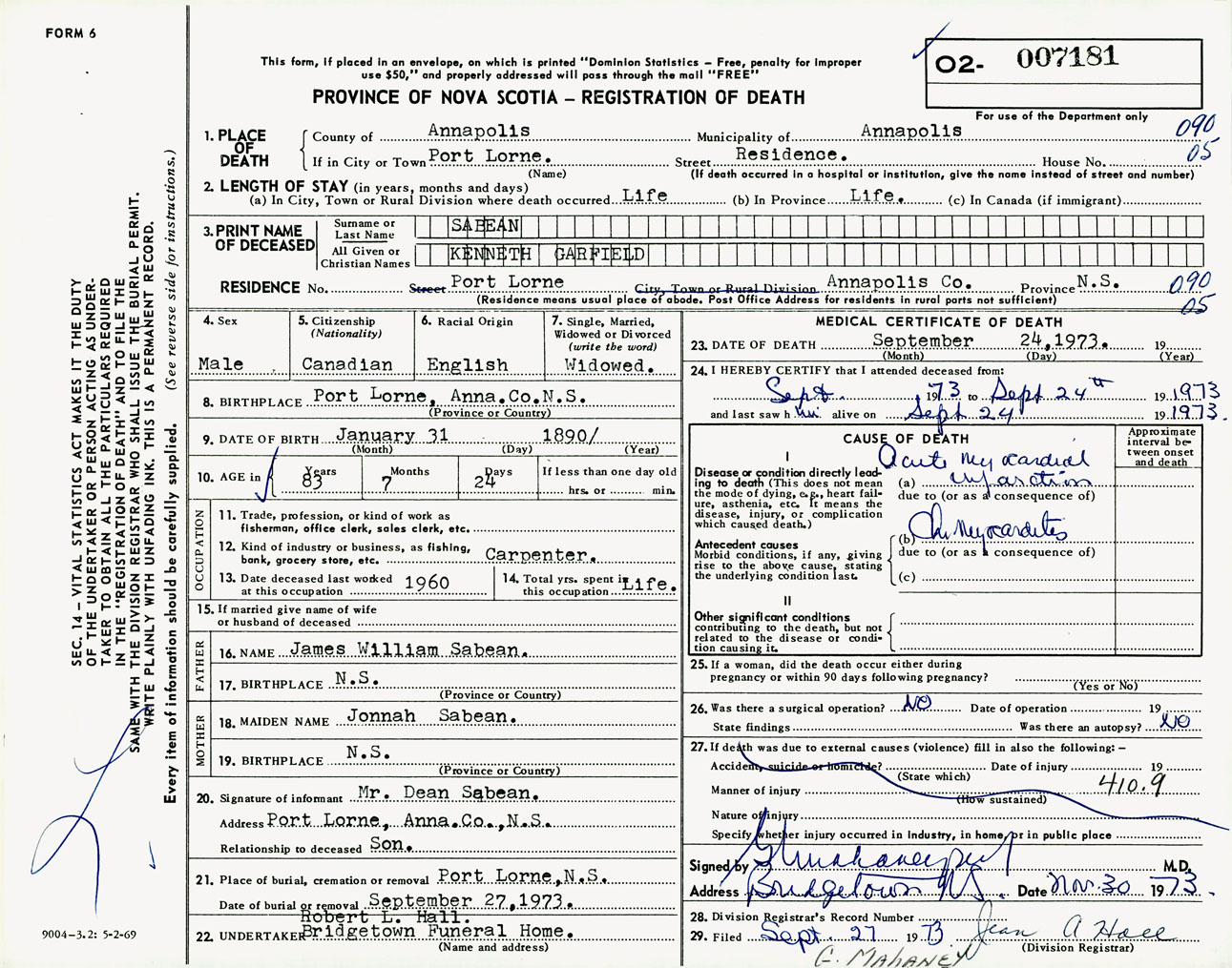 Male Death Registration: Year: 1973 number: 7181