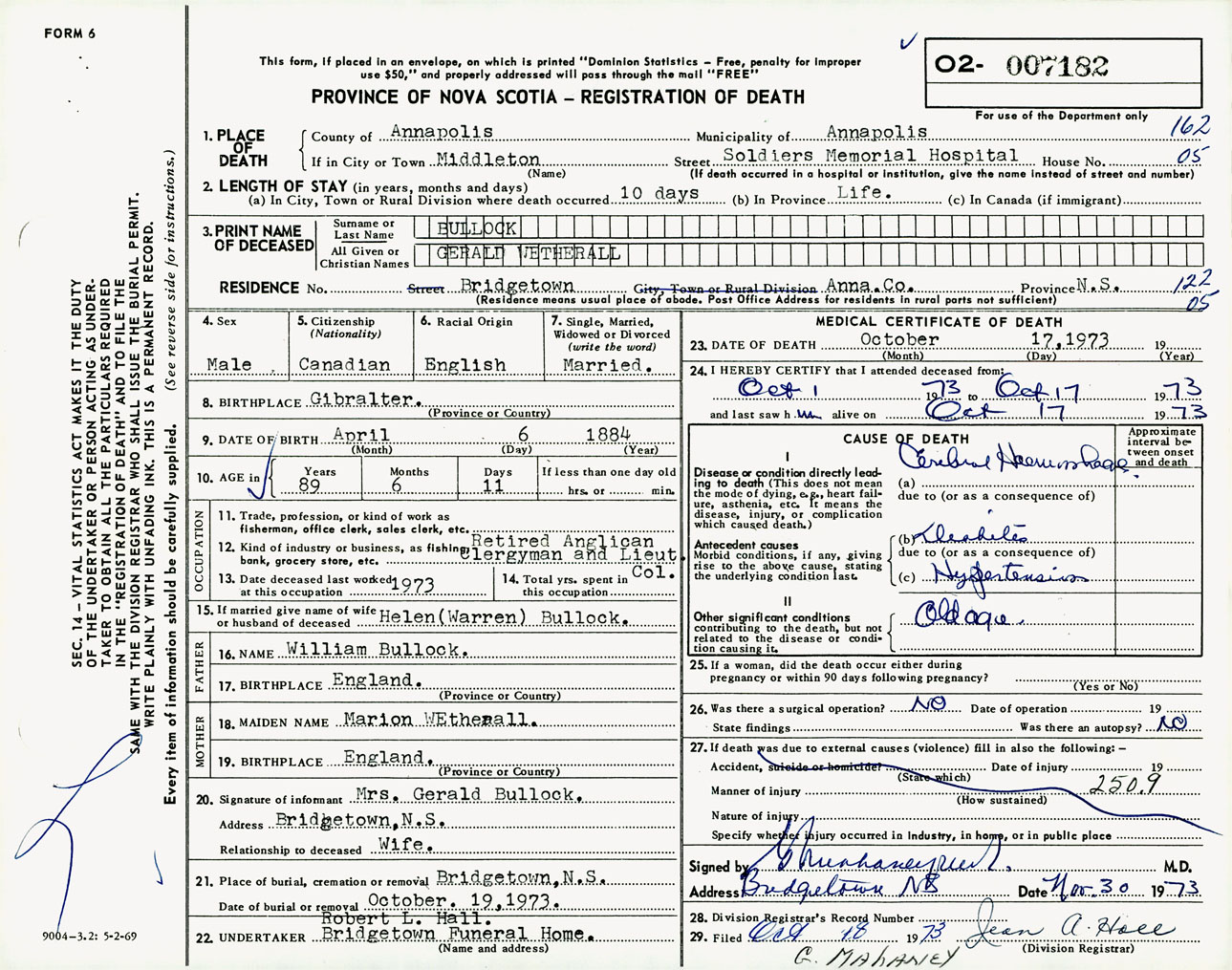 Male Death Registration: Year: 1973 number: 7182