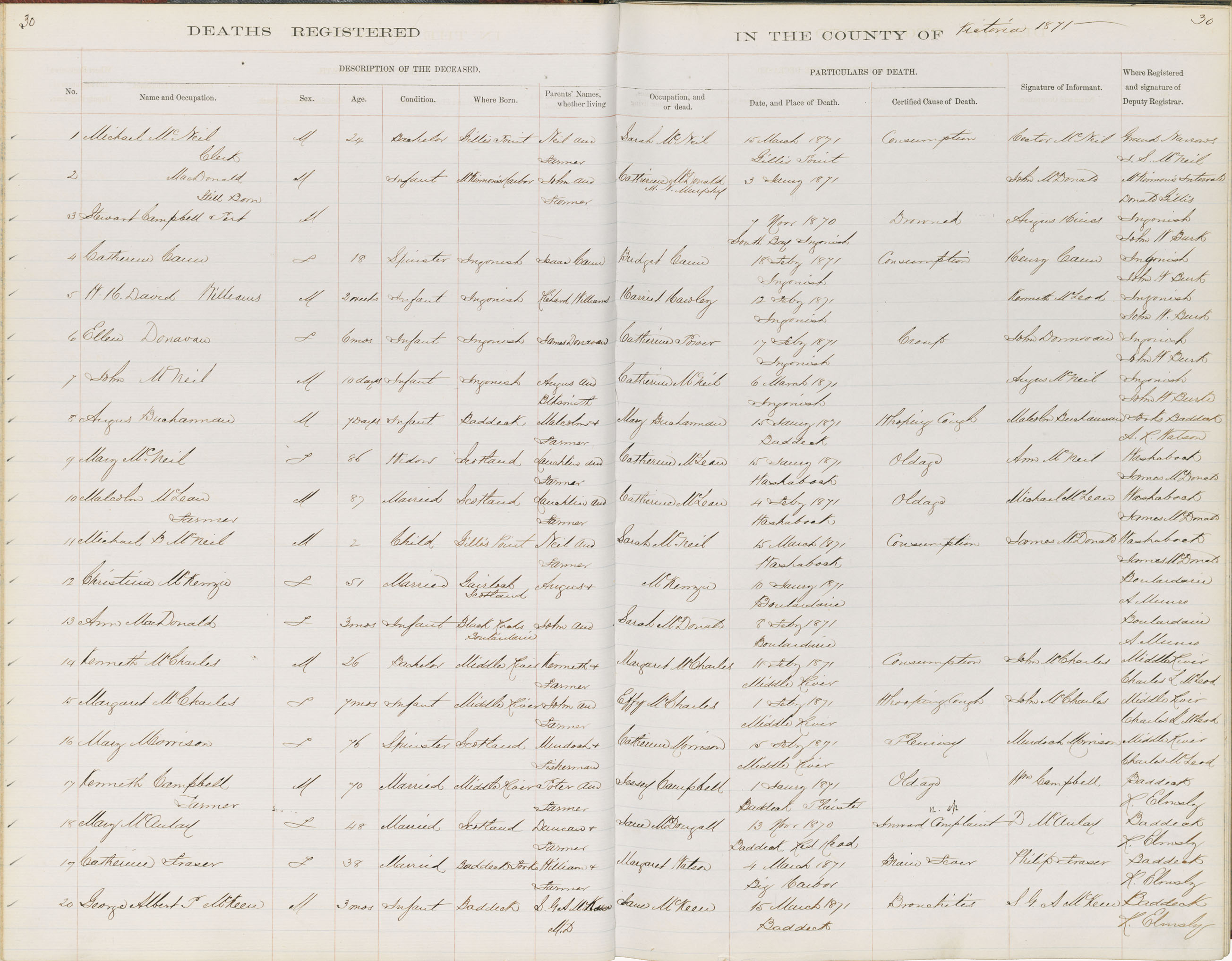 Male Death Registration: Year: 1871 book: 1817 page: 30 number: 2