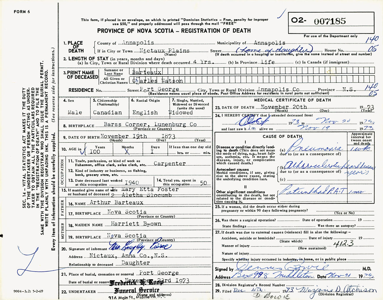 Male Death Registration: Year: 1973 number: 7185