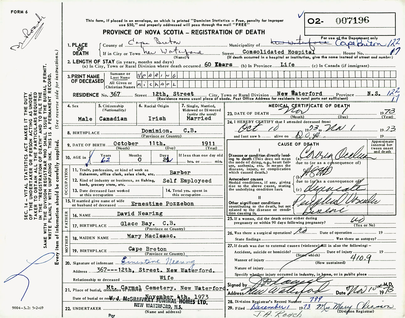 Male Death Registration: Year: 1973 number: 7196
