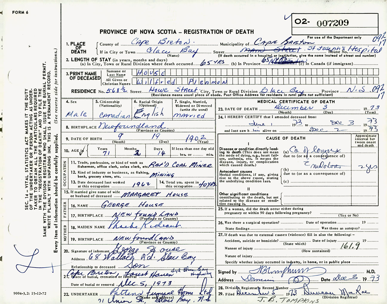 Male Death Registration: Year: 1973 number: 7209