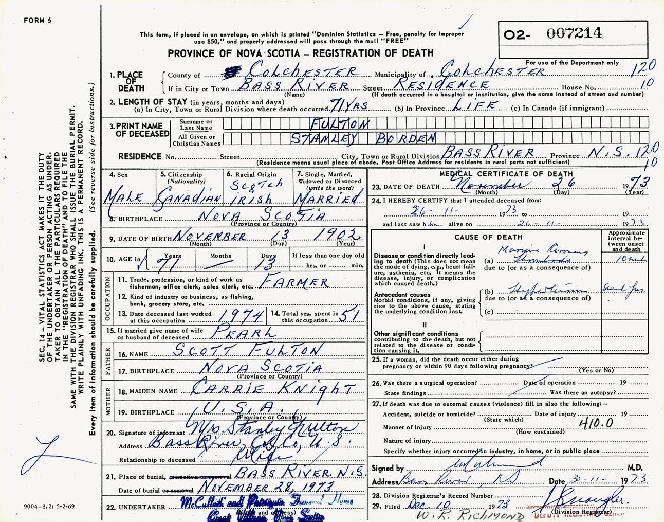 Male Death Registration: Year: 1973 number: 7214