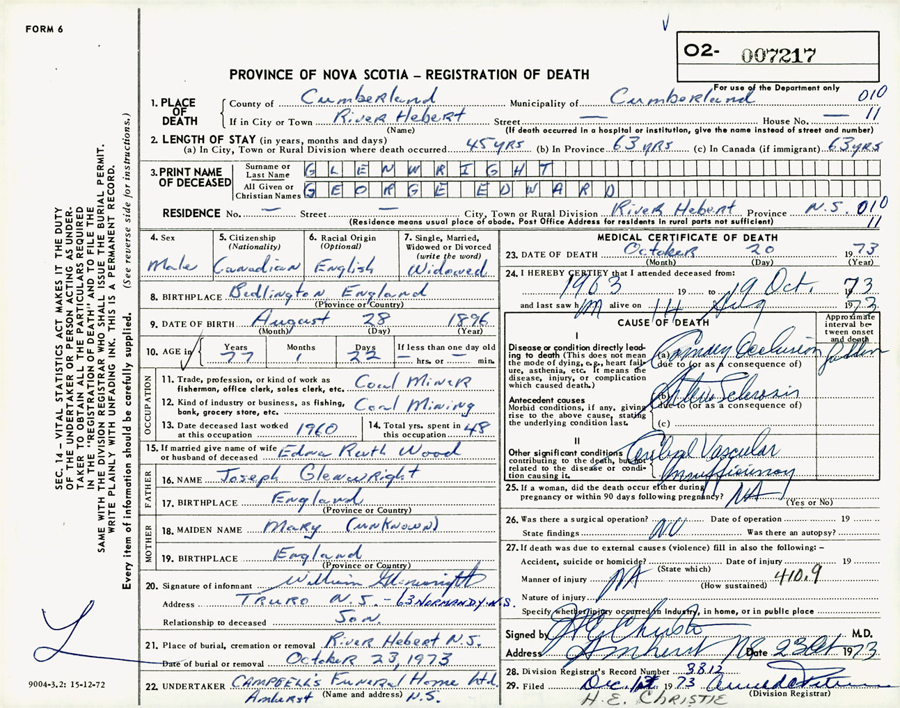Male Death Registration: Year: 1973 number: 7217