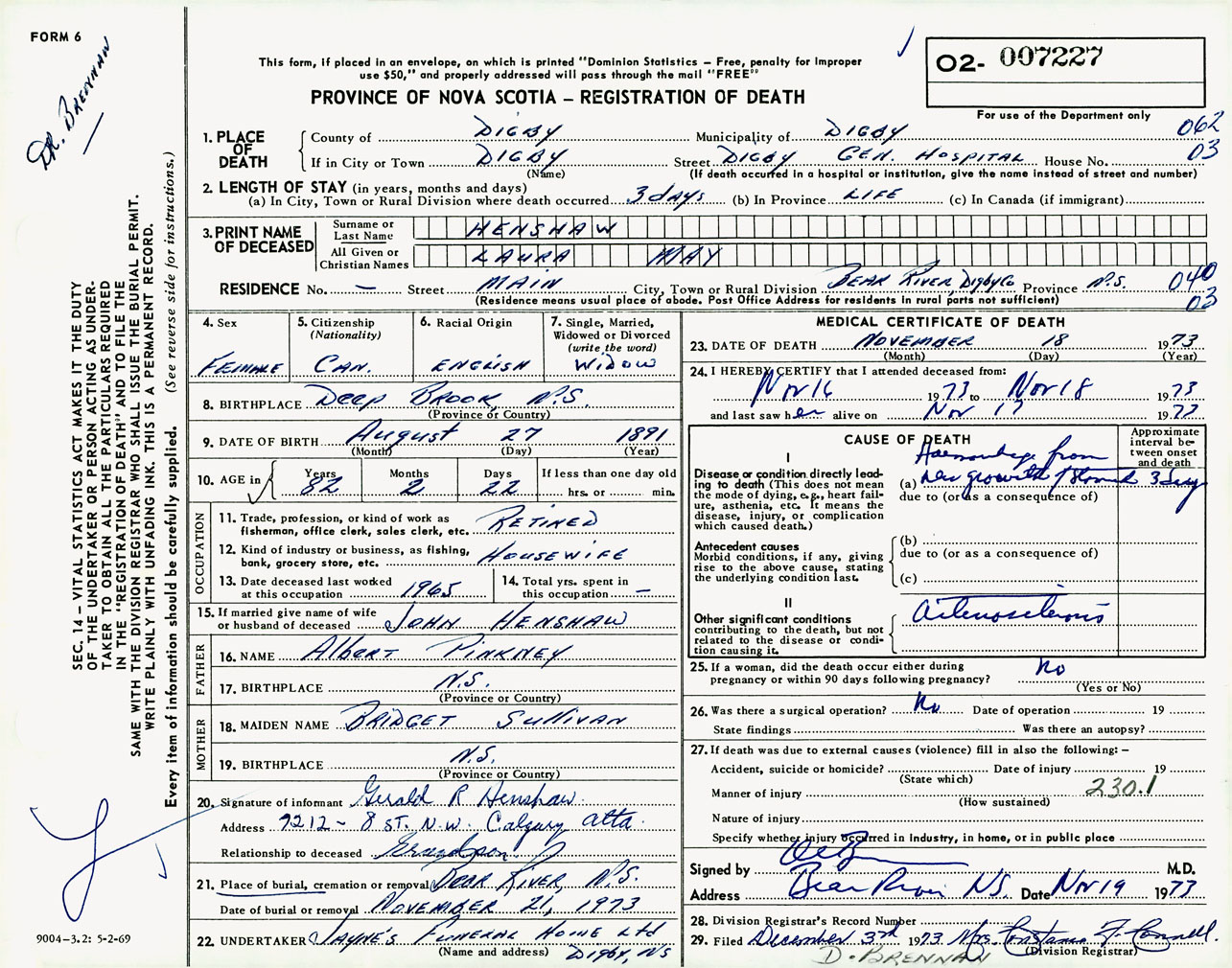 Female Death Registration: Year: 1973 number: 7227