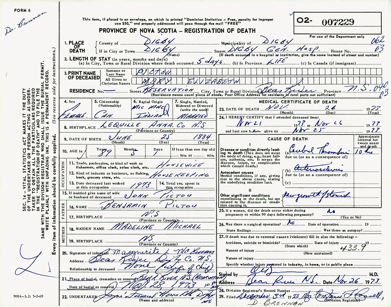 Female Death Registration: Year: 1973 number: 7229