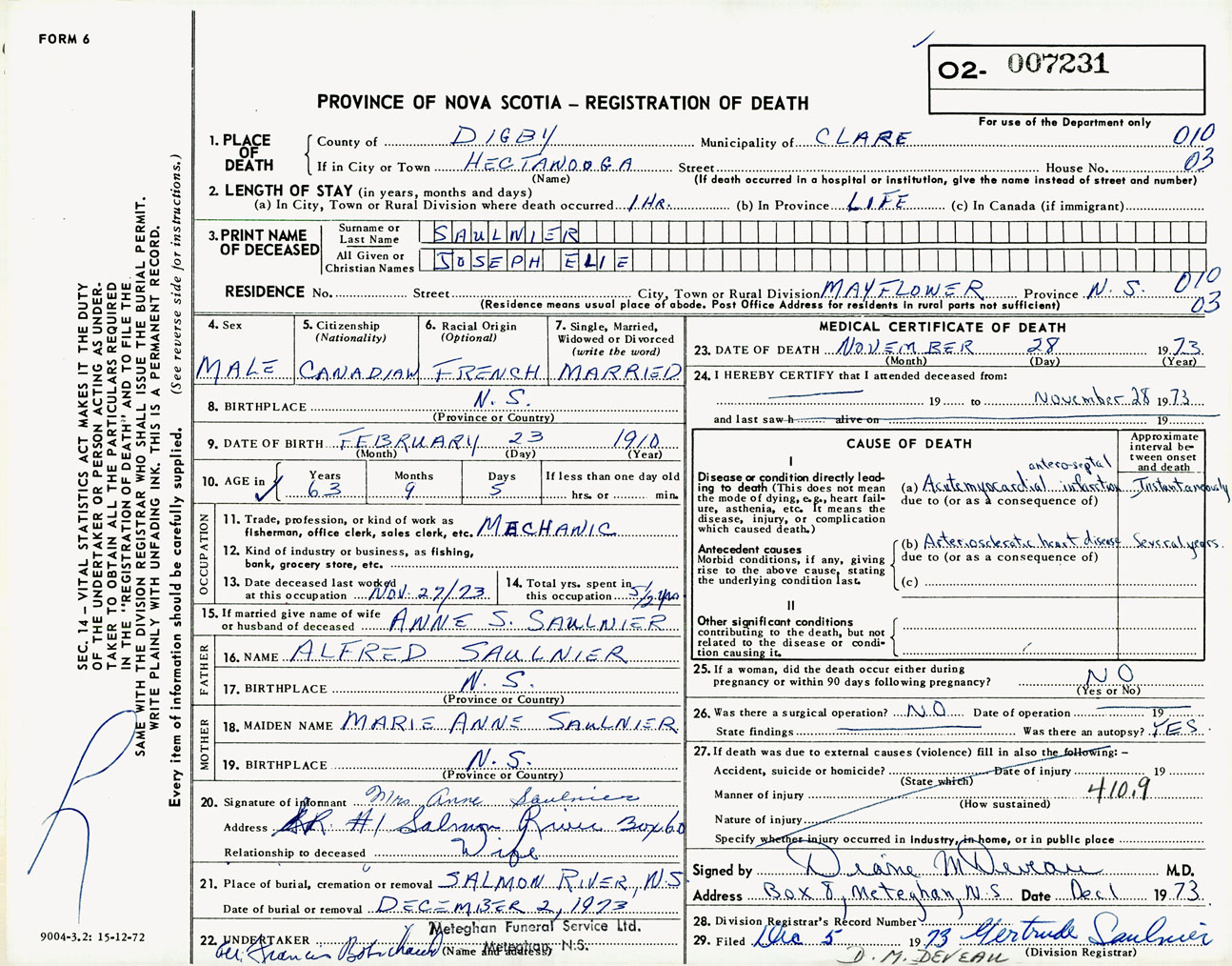 Male Death Registration: Year: 1973 number: 7231